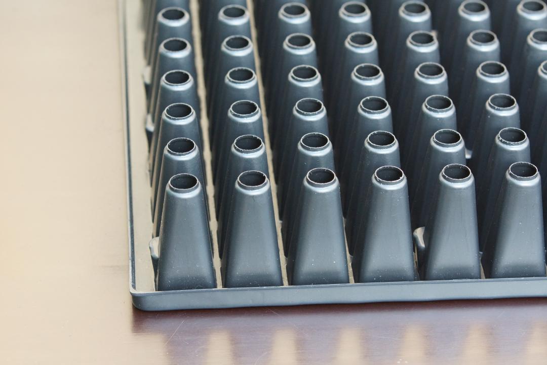 Wir nutzen diese Plattengröße für die Aussaat von Tomaten, Chilis, Basilikum und bei der Anzucht von Gehölz- und Staudenstecklingen im Sommer. Im Gegensatz zu Aussaatschalen entwickeln sich die jungen Pflanzen kräftiger, da sie schon während der Keimung nicht zu dicht stehen. Das oft mit einem kurzen Wachstumsstopp verbundene Pikieren kann entfallen. Die Jungpflanzen können aus den Multitöpfen mit kräftigem Wurzelballen direkt in größere Pflanzgefäße umgetopft werden.
